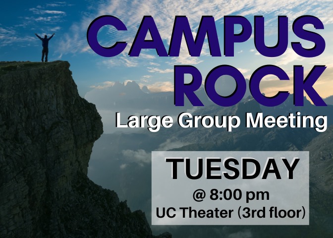 This week Campus Rock will be having their large group meeting on Tuesday, NOT MONDAY, in the UC Theater! (3rd floor).
