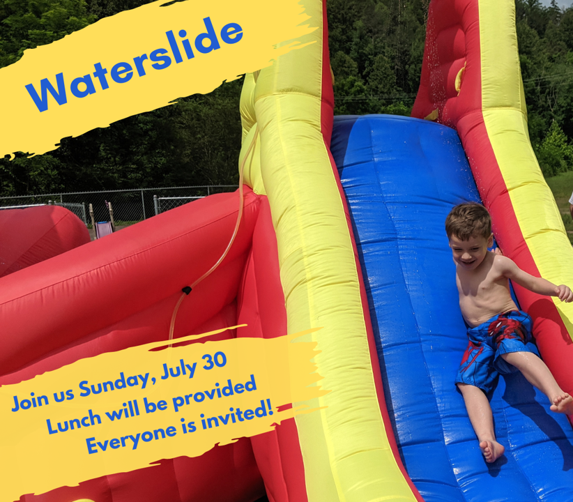 Waterslide: Join us Sunday, July 30 for slip-n-slide fun at our inflatable waterslide (for the kids), right after church! Lunch will also be provided! Everyone is invited!